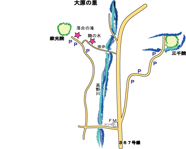 交通 市バス・京都バスともに「大原」で下車して、約15分〜20分程度