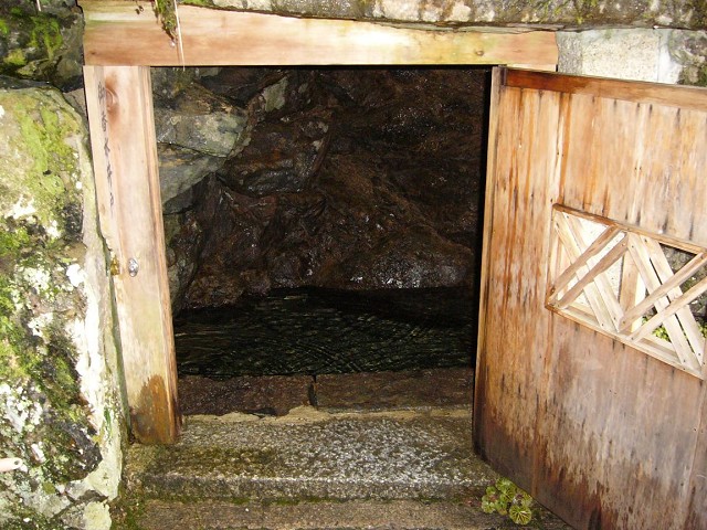 石垣の小さい木製の建具を開けてください。